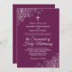 Este belo convite para o casamento é perfeito para uma cerimônia católica moderna. Apresenta um belo design com uma elegante inscrição escrita e ornamentados de folha fina de cinza prateada e espirais nos cantos de um fundo magenta, roxo de cassis ou cor de morango. Inclui uma cruz ou crucifixo, e uma formulação convidando seus convidados a assistir a uma massa nupcial unindo o casal no sacramento do matrimônio sagrado. Este convite é a combinação perfeita de tradição formal e estilo moderno, fazer uma maneira maravilhosa de convidar seus amigos e família a compartilhar sua alegria no seu dia especial.