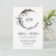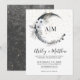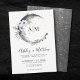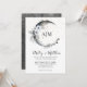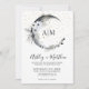 Convite de Casamento com Monograma Celestial Boho Star Crescente. Celebre uma noite sob as estrelas com este tema de casamento celestial boho leve e caprichoso. Um visual elegante, mas divertido, com um céu meia-noite em aquarela, lua crescente, estrelas douradas e flores brancas, penas e outros acentos que dão um toque de vibração boêmia. O verso tem uma aquarela de uma noite estrelada escura. Cores preto, branco, dourado e cinza no geral. Uma mistura elegante de tipografia cursiva e uma fonte serifada. Você terá uma noite mística sob este céu de lua crescente.