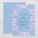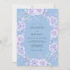 Este design apresenta um fundo azul periwinkle sereno adornado com flores de aquarela suaves. Rosas lavanda delicadas e hortênsias roxas pálidas são artisticamente arranjadas com folhagens tênues para criar uma atmosfera celestial. A paleta de tons frios de lilás e azul de centáurea invoca uma estética sonhadora para um evento sazonal. Esta obra de arte captura a essência de um prado romântico em flor.