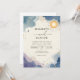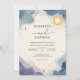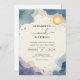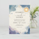 Lavagens de aquarelas etéreas em azuis profundos e púrpura evocam uma atmosfera celestial e sonhosa. speck ouros e uma explosão solar radiante criam uma sensação mágica e cósmica para um evento inesquecível.