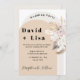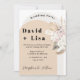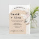 Este convite para o casamento apresenta um design boho chic com um fundo bege enquadrado por arcos brancos e beges. O canto superior direito é adornado com um arranjo floral detalhado de grama-palha, folhas-beige e rosas-rosa, criando um aspecto elegante e natural.