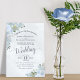 Este convite para o casamento apresenta um design floral de cor d'água rústica com rosas pintados à mão e flores em tons de azul poeirento, com folhas de eucalipto folhagem e verde. A inscrição é feita na caligrafia de rico com um fundo azul de aço pálido marmoreado. A parte de trás do convite é uma cinza azul com um buquê de floração e folhagem amarrada com um arco branco.