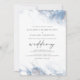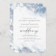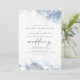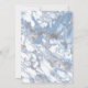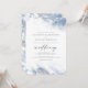 Este elegante convite para o casamento apresenta um design empoeirado, azul e branco, de borda aquosa, imitando o mármore veinado com folha de prata falsa, desaparecendo gradualmente no fundo branco. A palavra "casamento" aparece na escrita de cinzas, com o texto restante em maiúsculas de serifa. O padrão empoeirado de mármore azul e prateado é repetido na parte de trás do cartão.