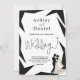 Este elegante convite de casamento preto e branco é perfeito para um casamento moderno. O simples design apresenta uma caligrafia preta elegante, um quadro preto chic e uma ilustração noiva e noiva sobre um fundo branco limpo. O cartão de convite inclui os detalhes do casamento no verso, em vez de pagar um cartão separado.