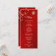A cereja vermelha floresce e um símbolo de felicidade dupla dourada num fundo vermelho brilhante. Com nomes personalizados de noiva e noivo, a data do casamento e um texto de menu personalizado. Do lado de trás está um texto tradicional chinês.
