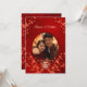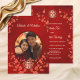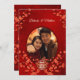 Este elegante convite para o casamento mostra uma foto oval cercada por galhos florescentes de cereja vermelha e um símbolo ouro de felicidade dupla em um fundo de ximersão. Nomes de noiva e noiva em um roteiro clássico elegante.