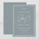 Convite de Casamento Clássico Elegante Azul e Branco. Design apresenta o script de caligrafia ''e'' em letras de tendências em um quadro branco dentro de fundo azul empoeirado.