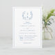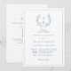 Convite de casamento com código QR azul real de coroa de monograma botânico e caligrafia elegante.