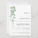 Convite de Casamento Código QR Eucalipto Aquarela. Um design botânico moderno. Adicione o seu código QR ao seu site de casamento no verso, tornando esta uma opção conveniente para que os seus convidados respondam e vejam todos os detalhes sem a necessidade de cartões separados de RSVP e detalhes. Tipografia contemporânea e simples que você pode personalizar facilmente. Um ramo elegante de folhas de eucalipto em aquarela desce pelo lado esquerdo.