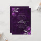 Este convite de casamento elegante apresenta ramos florais de ameixa realçados com folhagem prateada em fólio falso em dois cantos, sobre uma imagem de fundo de ágata de cor púrpura-ameixa em aquarela. O verso fornece espaço para detalhes do casamento, juntamente com um código QR que os convidados podem escanear para visitar seu site e responder, o que economiza o custo de impressão e envio de cartões de resposta separados.