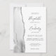 A borda esquerda deste elegante convite de casamento moderno apresenta uma cinza e uma aquarela branca, aparada com falso brilho prateado. O texto personalizável combina manuscrito, copperplate e fontes itálicas em cinzas de carvão em um fundo branco. O lado inverso apresenta um design agate correspondente.