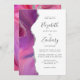 A borda esquerda deste elegante convite de casamento moderno apresenta uma cor de água magenta, cortada na borda com falso brilho prateado. O texto personalizável combina manuscrito, copperplate e fontes itálicas em cinzas de carvão em um fundo branco. O verso apresenta um magenta e um design de agata prateado correspondentes.