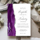 A borda esquerda deste elegante convite de casamento moderno apresenta uma cor d'água roxa, borda agitada com falso brilho prateado. O texto personalizável das cinzas de carvão combina letra de mão, chapa de impressão e fontes itálicas em um fundo branco. O verso apresenta um design de agata prateado e roxo correspondente.
