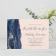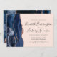 A borda esquerda deste elegante convite de casamento moderno apresenta um marinho azul de aquarela agate bordado com falso brilho rosa de ouro. O texto personalizável combina a escrita manual de cinzas de carvão, fontes em copperplate e itálico em um fundo cor-de-rosa pincelado. O verso apresenta um design marinho de agate azul e rosa dourado correspondente.