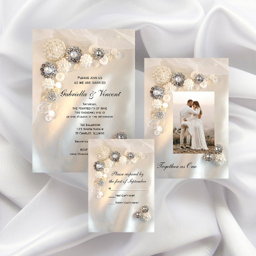 O bonito Faux Pearl e Diamond Buttons Wedding Invitation é perfeito para a noiva que está carregando um buquê de botão no corredor. Este elegante convite personalizado apresenta uma fotografia de vários estilos de botões vintage de pérolas brancas e de diamante com um fundo branco de satin definindo um tom de classe para sua cerimônia nupcial.