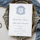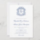 Este convite de casamento com monograma azul francês elegante apresenta um brasão ornamentado com caligrafia cursiva entrelaçada para as iniciais dos noivos e os nomes, em preto e branco clássicos. Encontre produtos correspondentes na coleção ou envie uma mensagem através do Zazzle Chat para mais produtos e ajustes de design.