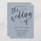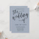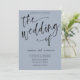 Simples modelo de convite de casamento com uma letra elegante escrita à mão em preto num fundo azul empoeirado. Personalize o texto para criar algo realmente exclusivo.
