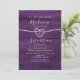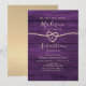 Simples, elegante, convite de recepção de casamento de madeira roxa com caligrafia moderna e coração de corda dourada falsa.