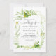 Convite de casamento verde que inclui samambaias, flores silvestres e morangos e um fundo de lavagem de cor verde-aquosa.
