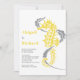 Cavalo-marinho e convite para casamento de algas amarelas e cinzas, que incluem um cavalo-marinho amarelo e algas-cinzas, enquanto os nomes são escritos numa tipografia moderna e ousada. Este modelo é perfeito para um casamento de praia de verão. A parte de trás é de cor de cinza sólida.