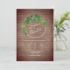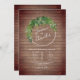Um convite de casamento com uma ilustração de verde em torno de nomes de noiva e noivo sobre uma tábua de madeira inspirava inspiração.