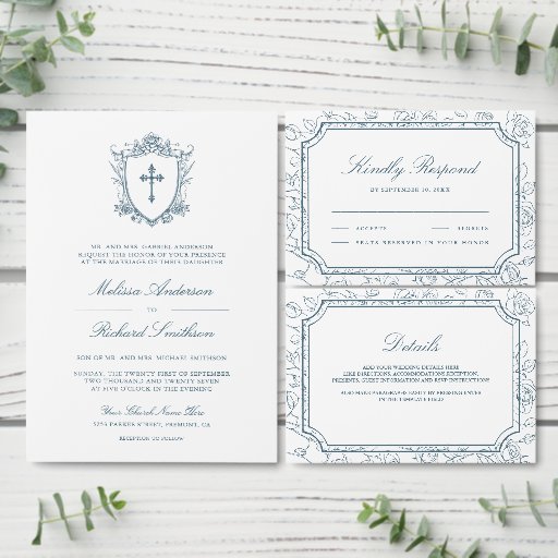 Surpreenda seus convidados com este elegante convite de casamento católico apresentando uma bela crista vitoriana com detalhes intrincados e código QR para RSVP online. Basta adicionar os detalhes do seu evento neste modelo fácil de usar e adorar este cartão com as suas fotografias favoritas para o tornar um convite único.