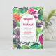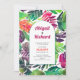 Folhas tropicais coloridas maximalistas e convite para casamento em arco com código QR. Este vibrante e animado convite de casamento apresenta uma impressionante mostra de folhas tropicais coloridas maximalistas e um elegante design de arco. O convite é enfeitado com um belo padrão de folhas tropicais em tons de verde, laranja, roxo e magenta rosa, criando um design visualmente impressionante e atraente para os olhos. O texto personalizado é elegantemente enquadrado dentro do arco, com os nomes do casal mostrados em tipografia ousada, servindo de ponto focal cativante. No verso do convite, uma banda branca vertical apresenta orgulhosamente as iniciais do casal feliz e um código QR para RSVP on-line.