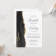 A borda esquerda deste elegante convite de casamento moderno apresenta uma coloração aquosa preta, borda agitada, aparada com falso brilho dourado. O texto personalizável combina manuscrito dourado, fontes em copperplate e itálico em um fundo branco. O verso apresenta um design de agate preto e dourado correspondente. O verso fornece espaço para detalhes do casamento em um fundo branco sólido, junto com um código QR que os convidados podem digitalizar para visitar seu site e RSVP, o que economiza o custo de imprimir e enviar cartões RSVP separados.