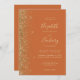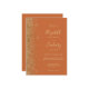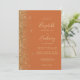 A borda esquerda deste elegante convite de casamento moderno apresenta um design dourado falso. O texto personalizável combina manuscrito pálido de cor dourada, fontes copperplate e itálico em um fundo laranja queimado. O verso fornece espaço para detalhes do casamento em um fundo sólido, junto com um código QR que os convidados podem digitalizar para visitar seu site e RSVP, o que economiza o custo de imprimir e enviar cartões RSVP separados.