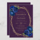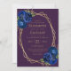 Este design apresenta uma moldura geométrica dourada decorada com buquês florais de cor azul-real e verde-aquosa, circundando o texto dourado sobre fundo roxo profundo. O verso fornece espaço para detalhes do casamento em um fundo roxo sólido, junto com um código QR que os convidados podem digitalizar para visitar seu site e RSVP, o que economiza o custo de imprimir e enviar cartões RSVP separados.