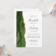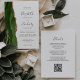 A borda esquerda deste elegante convite de casamento moderno apresenta um caçador de aquarela verde agata borda com falsa brilho dourado. O texto personalizável combina manuscrito, copperplate e fontes itálicas em cinzas de carvão em um fundo branco. O verso fornece espaço para detalhes do casamento em um fundo branco sólido, junto com um código QR que os convidados podem digitalizar para visitar seu site e RSVP, o que economiza o custo de imprimir e enviar cartões RSVP separados.