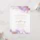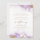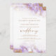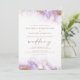 Este elegante convite para o casamento apresenta uma design de borda de aquarela lavanda em imitação de mármore veinado com folha de ouro falsa, desaparecendo gradualmente no fundo branco. A palavra "casamento" aparece em escrita manuscrita dourada, com o texto remanescente em maiúsculas de serifa douradas. O verso oferece espaço para detalhes do casamento, juntamente com um código QR que os convidados podem digitalizar para visitar seu site e RSVP, o que economiza o custo de impressão e envio de cartões RSVP separados.