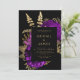 Este elegante e modesto convite de casamento apresenta um buquê floral romântico e exuberante em roxo com folha de ouro e folhagem brilhante num fundo negro. Personalize o texto dourado em fontes na moda em um retângulo preto. O verso fornece espaço para detalhes do casamento em um fundo preto sólido, junto com um código QR que os convidados podem digitalizar para visitar seu site e RSVP, o que economiza o custo de imprimir e enviar cartões RSVP separados.