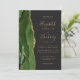 A borda esquerda deste elegante convite de casamento moderno apresenta um caçador de aquarela verde agata borda com falsa brilho dourado. O texto personalizável combina manuscrito dourado, fontes em copperplate e itálico em um fundo fora de preto. O verso fornece espaço para detalhes do casamento em um fundo escuro sólido, junto com um código QR que os convidados podem digitalizar para visitar seu site e RSVP, o que economiza o custo de imprimir e enviar cartões RSVP separados.