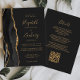 A borda esquerda deste elegante convite de casamento moderno apresenta uma coloração aquosa preta, borda agitada, aparada com falso brilho dourado. O texto personalizável combina manuscrito dourado, fontes em copperplate e itálico em um fundo preto de slate. O verso apresenta um design de agate preto e dourado correspondente. O verso fornece espaço para detalhes do casamento em um fundo branco sólido, junto com um código QR que os convidados podem digitalizar para visitar seu site e RSVP, o que economiza o custo de imprimir e enviar cartões RSVP separados.