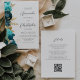 A borda esquerda deste elegante convite de casamento moderno apresenta um azul lacrimogêneo e uma borda floral aqua aparada com folhagem de folhas falsas de ouro. O texto personalizável combina o script de cinza de carvão e as fontes sans serif em um fundo branco. O verso oferece espaço para detalhes do casamento, juntamente com um código QR que os convidados podem digitalizar para visitar seu site e RSVP, o que economiza o custo de impressão e envio de cartões RSVP separados.