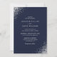 Elegantes convites de casamento marinho azul e prateado com confete prateado cintilante em um fundo azul marinho comum com fonte moderna. Convites de casamento chic perfeitos para um casamento elegante e luxuoso.
