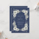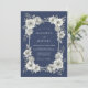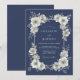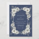 Um fundo romântico azul-marinho é adornado com um delicado desenho de coroa floral esbranquiçada, apresentando pétalas suaves e ramos folhosos. Este motivo elegante cria uma atmosfera encantadora e sofisticada, perfeita para uma celebração de casamento clássico. Os detalhes florais discretos evocam um senso de beleza atemporal.