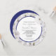 Este convite de casamento redondo apresenta uma fotografia de flores brancas de gerânio como fundo. Um círculo branco com uma borda azul marinho no centro apresenta texto personalizável para seus detalhes de informações de casamento. O verso deste convite tem a mesma cor azul marinho.