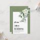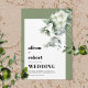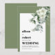 Este belo convite para o casamento mostra um espantoso quadro branco adornado com delicadas flores brancas e ramos de eucalipto, colocados elegantemente no canto superior direito. As faixas verdes de sábio acrescentam um toque de sofisticação à design, enquanto a tipografia ousada do texto mínimo cria um olhar moderno e na moda. A parte de trás do convite é lindamente colorida em uma sombra suave de verde sábio, completando a elegante e estética eterno geral.