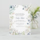 Flores de inverno em tons de azul empoeirado, verde-sábio, branco, creme e cinza enquadram seus detalhes de casamento nesses novos e novos convites para casamento. Espelhados com uma samambaia de flocos de neve na frente e atrás do cartão, esses convites dão uma vibração árctica gelada. As caixas de texto são fáceis de personalizar usando uma mistura de fontes modernas e caligráficas em cinzas médias e azul-poeirento escuro. A parte de trás do cartão é azul empoeirado escuro.