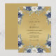 Navy profundo e flores brancas nítidas criam uma cascata dramática, mas elegante, em um rico cenário dourado. Folhagens delicadas entrelaçam os elementos florais, evocando um senso de romance atemporal e charme sofisticado. Este design oferece um toque luxuoso para uma ocasião memorável.