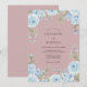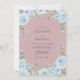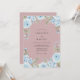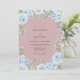 Delicados floresceres azuis celestes e folhagens suaves criam uma borda etérea. Este design evoca uma atmosfera romântica e caprichosa, perfeita para uma celebração de primavera ou verão. O fundo rosa suave realça a arte floral.