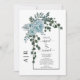 Flores azuis, cor d'água, arco e monograma, convite de casamento da primavera. Esta adorável design de casamento apresenta um arco com flores poeirentas de cacto azul e folhas no canto esquerdo e seu monograma. Os nomes estão na tipografia de scripts.