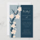 Japandi inspirou o convite para o casamento, apresentando um galho cerejeiro florescente no lado esquerdo do cartão contra um fundo azul claro, enquanto o texto do convite se destaca num pano de fundo azul mais escuro. O verso apresenta um padrão de coordenação em azul claro, adicionando um toque de fusão escandinava ao seu conjunto de convites.
