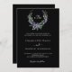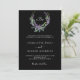 Fundo preto. Uma coroa floral feita de flores lavandas e de eucalipto verde de cor aquosa. Personalize e adicione suas iniciais, nomes e detalhes do monograma. Texto branco.
