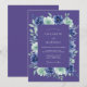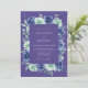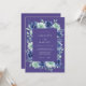 Este design apresenta um arranjo exuberante de flores profundas azuis e lavanda suave acentuadas com folhagem verde delicada. A obra de arte evoca uma atmosfera romântica e etérea, perfeita para um evento sofisticado.