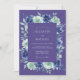 Este design apresenta um arranjo exuberante de flores profundas azuis e suaves lavandas acentuadas com folhagem verde delicada. A obra de arte evoca uma atmosfera romântica e etérea, perfeita para um evento sofisticado.