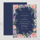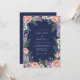 Rosas rosadas delicadas e flores de lavanda se entrelaçam com folhagem exuberante. Este design romântico evoca uma atmosfera sofisticada e etérea. O fundo azul-marinho profundo realça o arranjo floral vibrante.