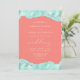 Este convite de casamento de moda apresenta folha aqua e folha fina prateada e bordas onduladas brilhantes no topo e no fundo sobre um fundo cor-de-rosa coral. A palavra "casamento" aparece em escrita caligráfica. Personalize o texto branco com os nomes da noiva e do noivo e os detalhes do casamento. O aqua e a design prateada são repetidos no verso.